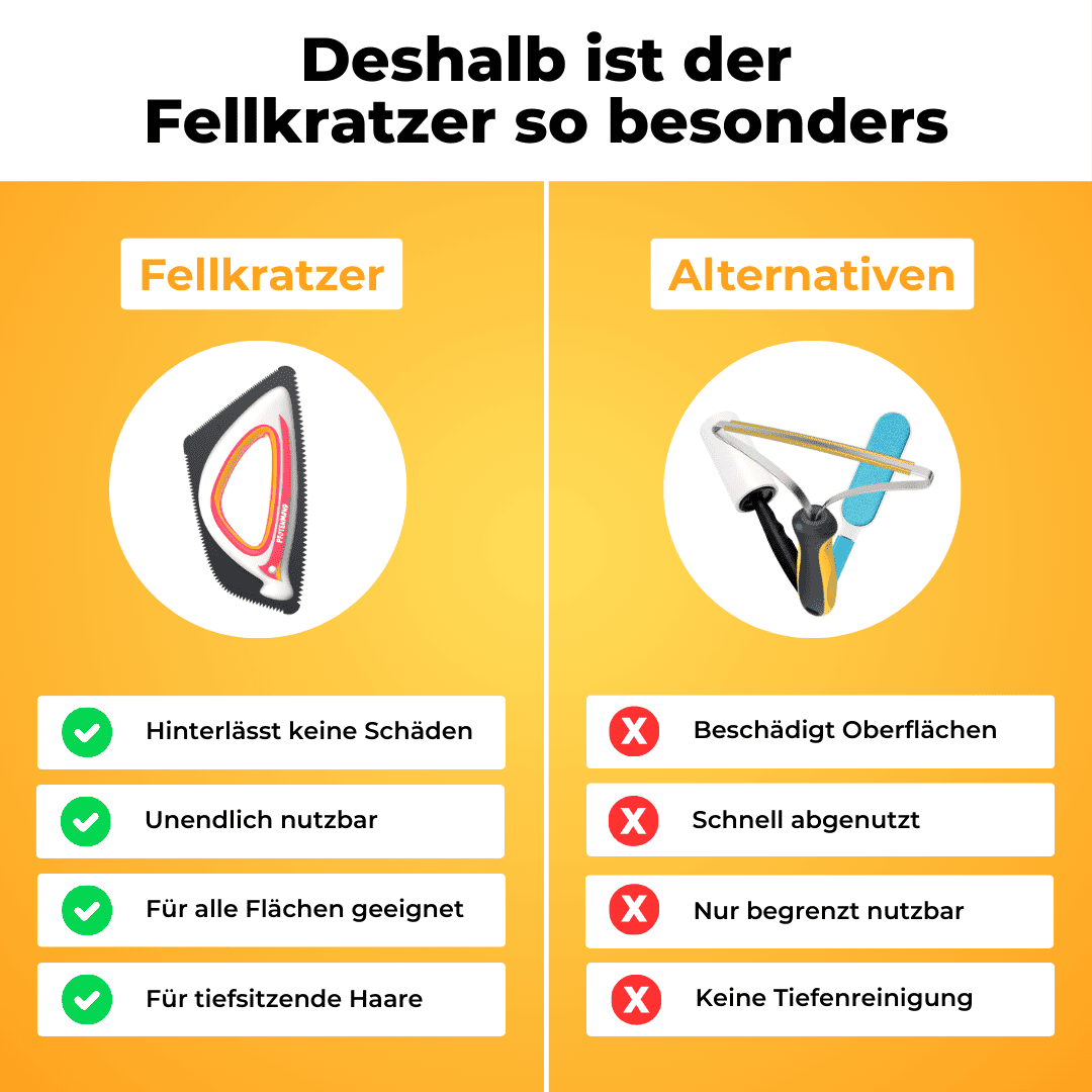 Im Gegensatz zu herkömmlichen Fusselrollen oder Bürsten brauchst du keine Ersatzrollen, keinen Kleber und keinen Strom. Der Fellkratzer ist unendlich oft wiederverwendbar und entfernt Haare bereits beim ersten Durchgang – schnell, gründlich und ohne Rückstände.